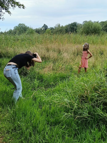 Soms sta ik midden in een veld, soms op mijn knieën in het gras, en soms half in een struik om nét dat perfecte hoekje te vinden. Maar dat zie je niet altijd op de foto's die jij te zien krijgt. Gelukkig zijn er van die momenten waarop iemand stiekem een behind-the-scenes foto maakt en laat ik eerlijk zijn: ik vind dat geweldig!